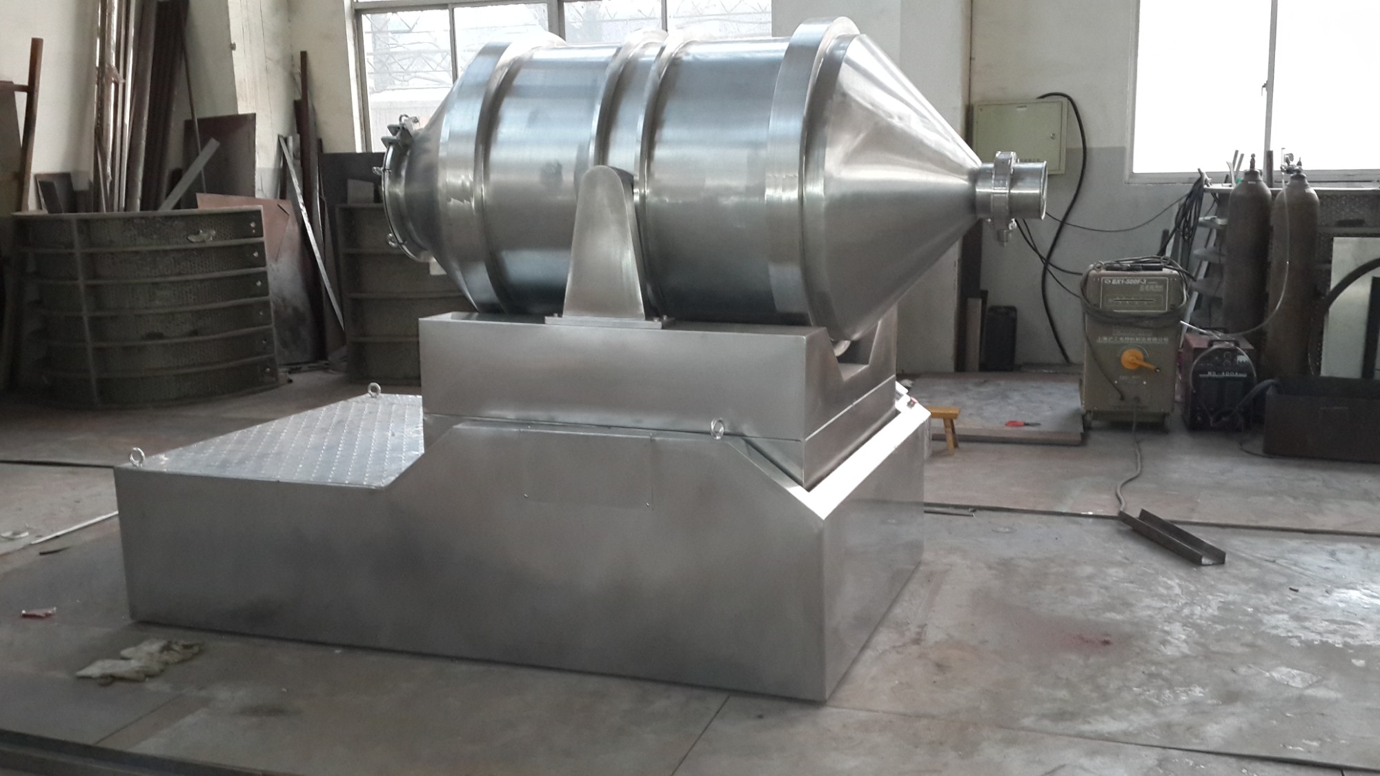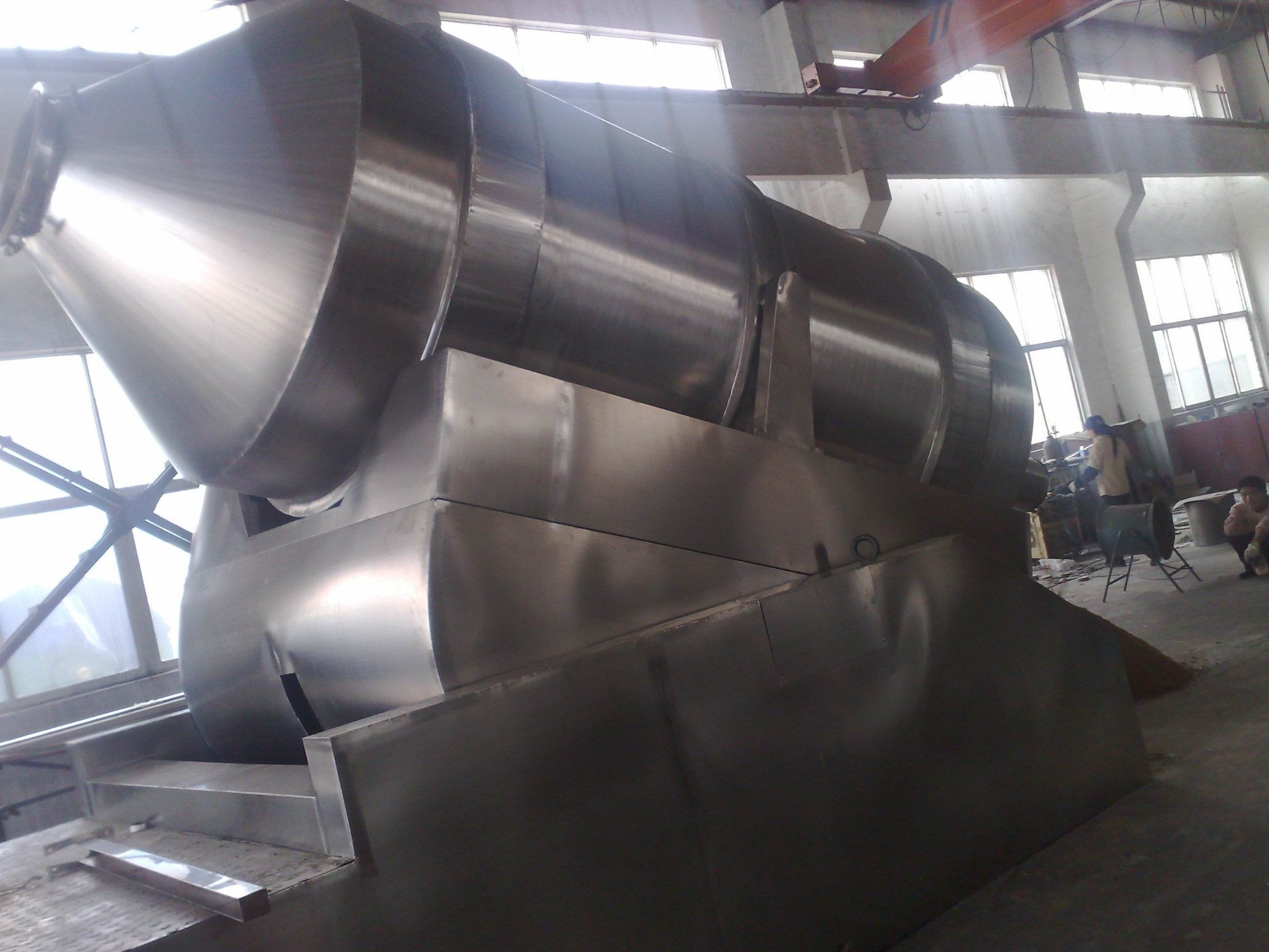 EYH Series 2 D Motion Mixer consists of three main parts, which are rotating cylinder, swinging rack and frame. The rotating cylinder lies on the swinging rack and supported by four wheels, and its axial fixation is done by two stop-wheels. Two of four wheels are driven by rotating power system to rotate the cylinder. The swinging rack is driven by a set of crankshaft swinging bar, which is mounted on the frame, and the swinging rack is supported on the frame as well.