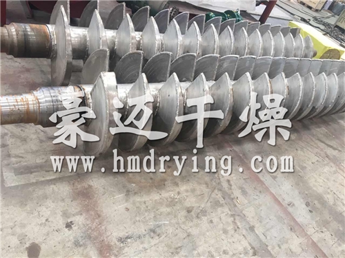 There are two or four hollow rotating shafts inside the equipment. The hollow shafts are densely arranged with wedge-shaped hollow blades in parallel. The structure design is special and ingenious. The dried sludge is quantitatively and continuously fed into the feeding port of the dryer by the screw feeder. The sludge enters the back of the dryer, and the sludge is turned and stirred by the rotation of the paddle blade. The heating interface is constantly updated and contacted with the device body and paddle blades. It is fully heated to evaporate the surface water contained in the sludge. ^After that, the qualified products dried evenly are discharged from the outlet.
