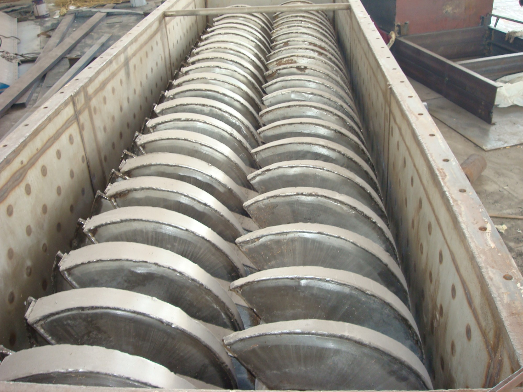 Dual counter-rotating shafts with unique intermeshing hollow wedge-shaped paddles produce intimate mixing, optimize heat transfer, and provide a self-cleaning feature. A large heat transfer area to volume ratio is achieved by the use of hollow paddles and a jacketed vessel, through which the heating medium flows. The result is an efficient, compact machine with less space requirements and lower installation cost.