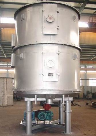 The wet material is fed continuously to the first drying layer on the top of the dryer. It will be turned and stirred by rakes when the rake arm rotates and drop down to the outer edge of the large drying plate along the exponential helical line. The material will be moved from the small drying plate to its outer edge and drop down to the outer edge of the large drying plate underneath. Both small and large drying plates are arranged alternately so the materials can go through the dryer continuously. The heat medium can be saturated steam, hot water or thermal oil. The heat will be led into hollow drying plates from one end and come out from the other end. The dried materials will drop from the last layer of the drying plate to the bottom of the dryer and then moved by rakes to the discharge outlet. The material moisture will be removed from the exhaust outlet on the top cover. For the vacuum-type plate dryer, the moisture will be sucked out by the vacuum pump on the top cover. The dried materials will be discharged from the bottom layer. The drying capability can be improved if the dryer equipped with supplementary devices such as finned heater, condenser for solvent retrieval, bag dust remover, return and mix mechanism, draft fan, and etc.