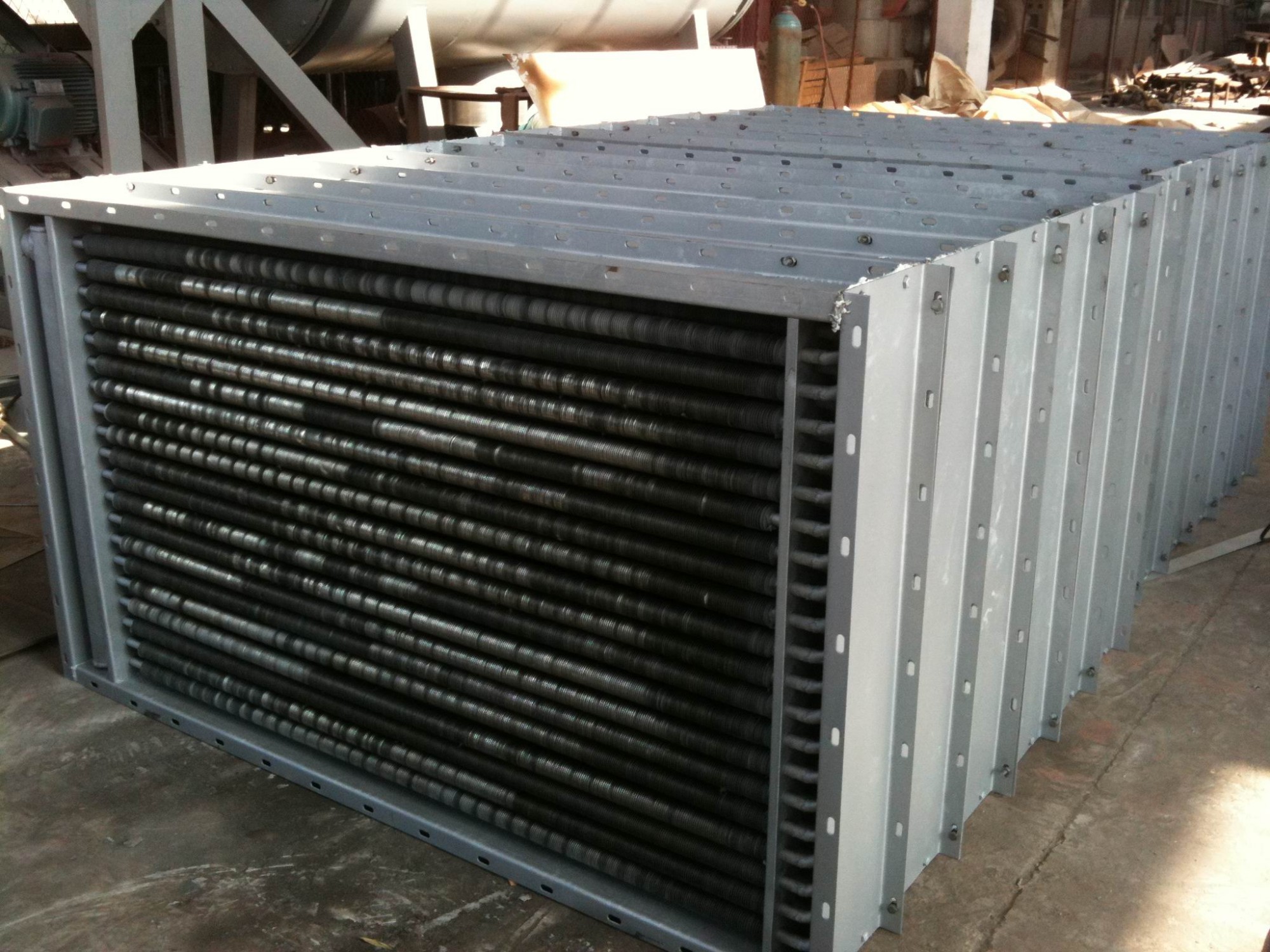 The heat exchanger is used for hot air warming, air conditioning, cooling, dehumidifying, drying, and etc. It’s utilized the steam or hot water to heat the air and utilized salt water or chill water to cool the air. It’s widely used for air conditioning system in mineral industry , light industry , pulp, chemical, national defense, textile, power , dairy , ceramic, hospital, theater, and etc. It’s constructed of spiral fin tubes and it has different specification for different models.