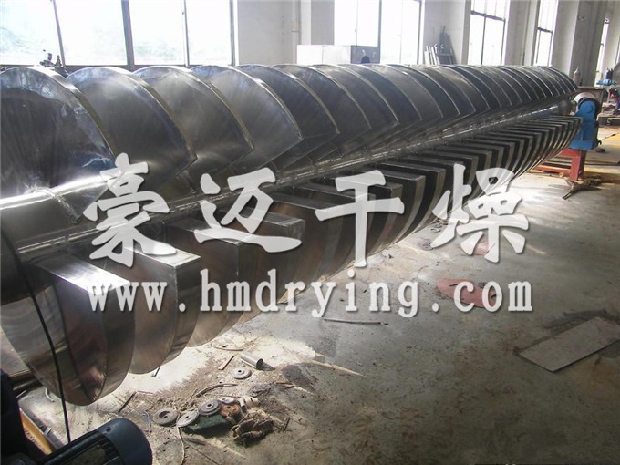 principle of activated sludge dryer: wedge type hollow blades are densely arranged on the hollow shaft, and the thermal medium heat transfer oil flows from the hollow axial flow to the blade, and the heat transfer area per unit effective volume is very high. The heat transfer medium flows through the rotary joint through the shell jacket and the hollow mixing shaft. The hollow mixing shaft has different internal structure according to the type of hot medium, so as to ensure good heat transfer effect. When the blade and jacket are heated by hot medium, the upper part of the outlet is dehumidified at the same time, which increases the drying strength of the machine. The evaporated water is taken out of the drying equipment by the dehumidification fan.