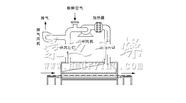 DWP type belongs to jet airflow belt drying, the principle is shown in the figure. In this type of equipment, the hot air flows down or up and down at the same time to the materials on the conveyor belt in the form of slit flow or hole bundle. As the jet gas velocity is higher than 15m / s, the convective heat transfer film is extremely thin, the heat transfer coefficient is large, and the drying speed is fast. This type of equipment is used to inject hot air up and down at the same time when airtight materials are used, and then participate in the circulation through the fan. It has strong penetrability and diffusibility in the material. This type of equipment is mainly used for fiberboard, gypsum board, carton board, pulp mold, coating drying, etc. it is also suitable for drying sheet, strip, granular materials and some special materials. If two-way air jet is used, the deformation of plate materials is small, and other types of materials are heated evenly, so it is not easy to produce sandwich state. The jet airflow belt type can use steam, electricity, coal-fired hot blast stove and fuel gas ventilation as the heat source.