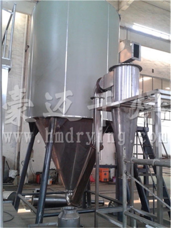 Spray drying machine is open type circulation, and flow type, centrifugal atomization. The air in the drying medium is filtered through a primary and medium efficiency air filter, and then pumped by a blower according to the operation instructions, then heated by a heater, and enters the spray drying main tower through the hot air distributor of the high efficiency filter. According to the operation instructions, the liquid material passes through the peristaltic pump and enters the high-speed rotating centrifugal nozzle. Under the action of centrifugal force, it is dispersed into small droplets. In the spray drying main tower, small droplets are fully contacted with the hot air, and after being heat exchanged along their specific paths, they are dried into products, then separated by cyclone separator, solid materials are collected, and the gas medium is filtered and then discharged. The whole spray system is easy to clean and has no dead angle, which is in line with GMP requirements.