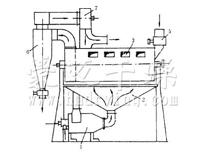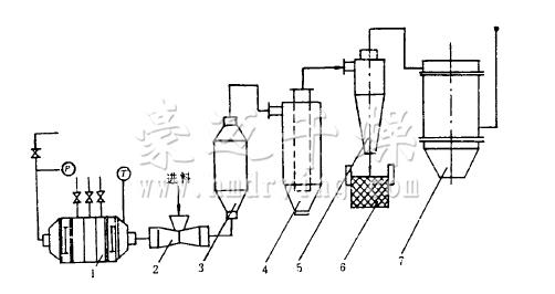 1 - hot blast stove 2 - air distribution chamber 3 - nozzle 4 - cyclone drying chamber 5 - feeder 6 - cyclone separator 7 - Fan