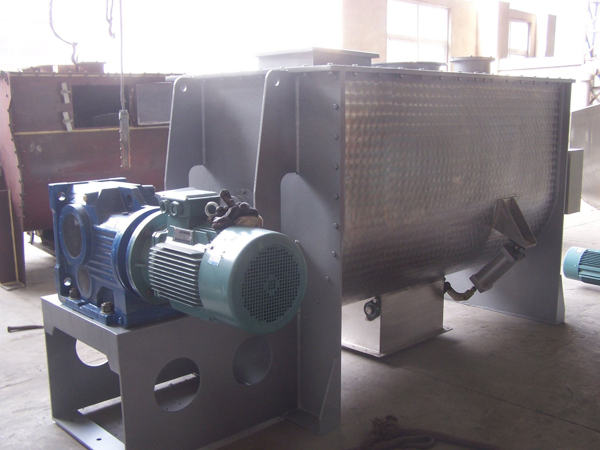 This machine consists of container, screw stirring paddles, and transitional parts; the screw paddle usually has 2 or 3 layers, the outer screw will push the material from the sides to the center, and the inner screw will push the material from the center back to the sides, the convection mixing is form in this way.